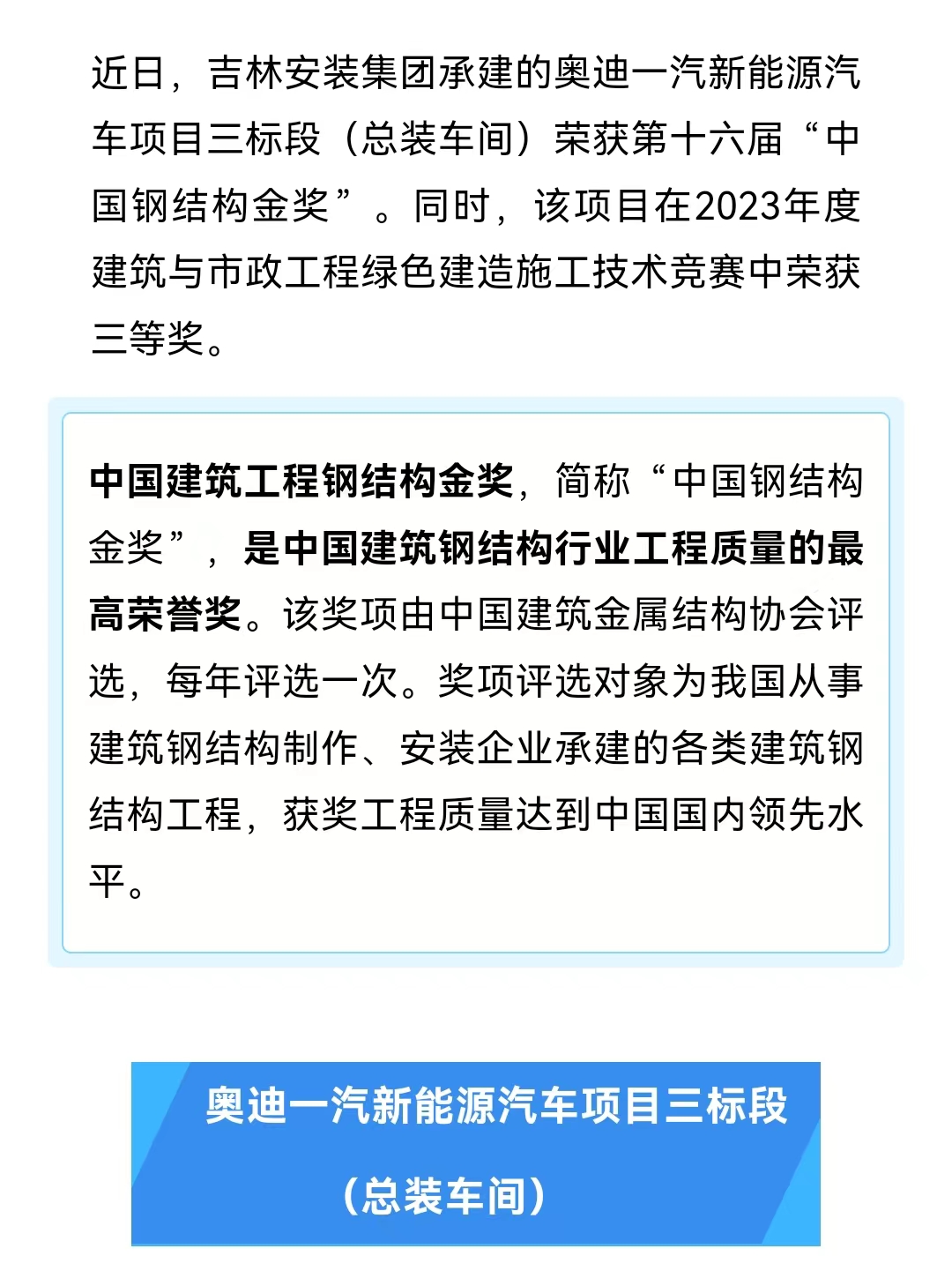 喜报|吉林安装集团荣获“中国钢结构金奖”等荣誉奖项